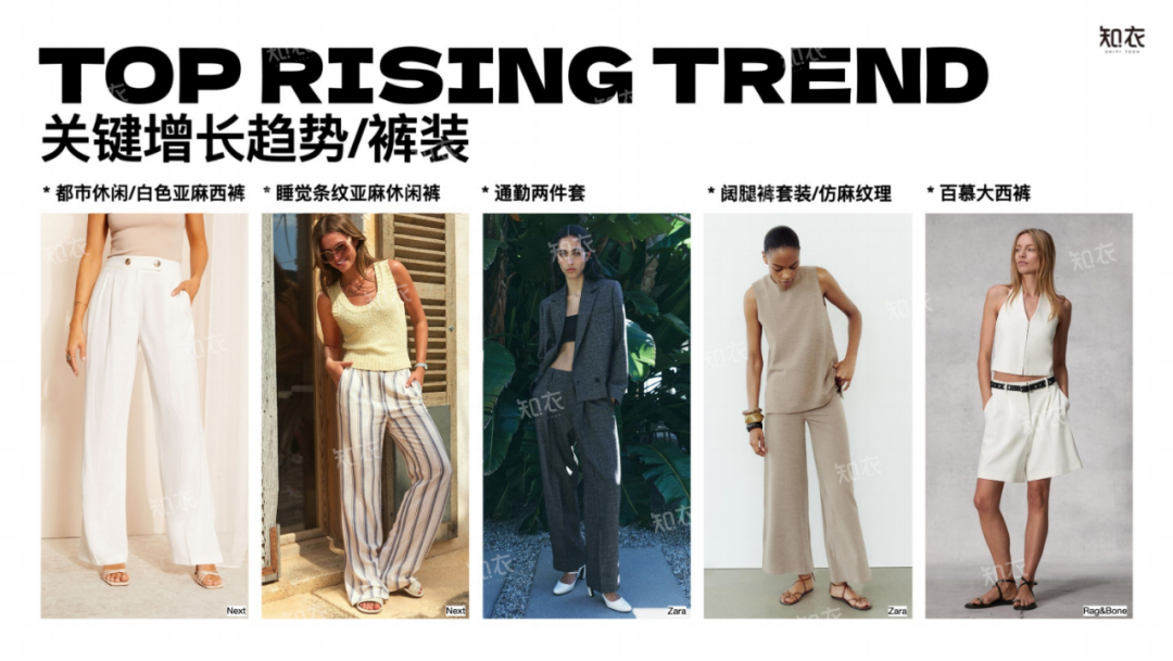 阔腿裤在春夏季节需求依旧强劲,经典的版型可俘获各年龄层群体,同时能满足商务休闲与度假休闲的需求。